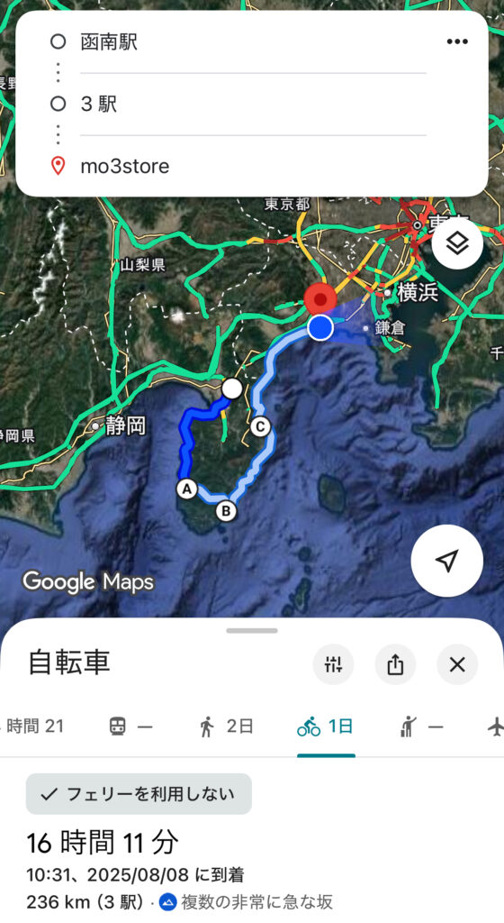 平塚出発→箱根越え→函南→大瀬崎→松崎→下田→伊東→湯河原→平塚